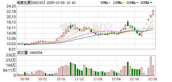 海南发展再度涨停,6个交易日内录得5个涨停,累计涨幅为72.09%,累计换手率为98.78%。截至9:51,该股今日成交量1.60亿股,成交金额35.28亿元,换手率19.97%。最新A股总市值达192.23亿元,A股流通市值182.81亿元。